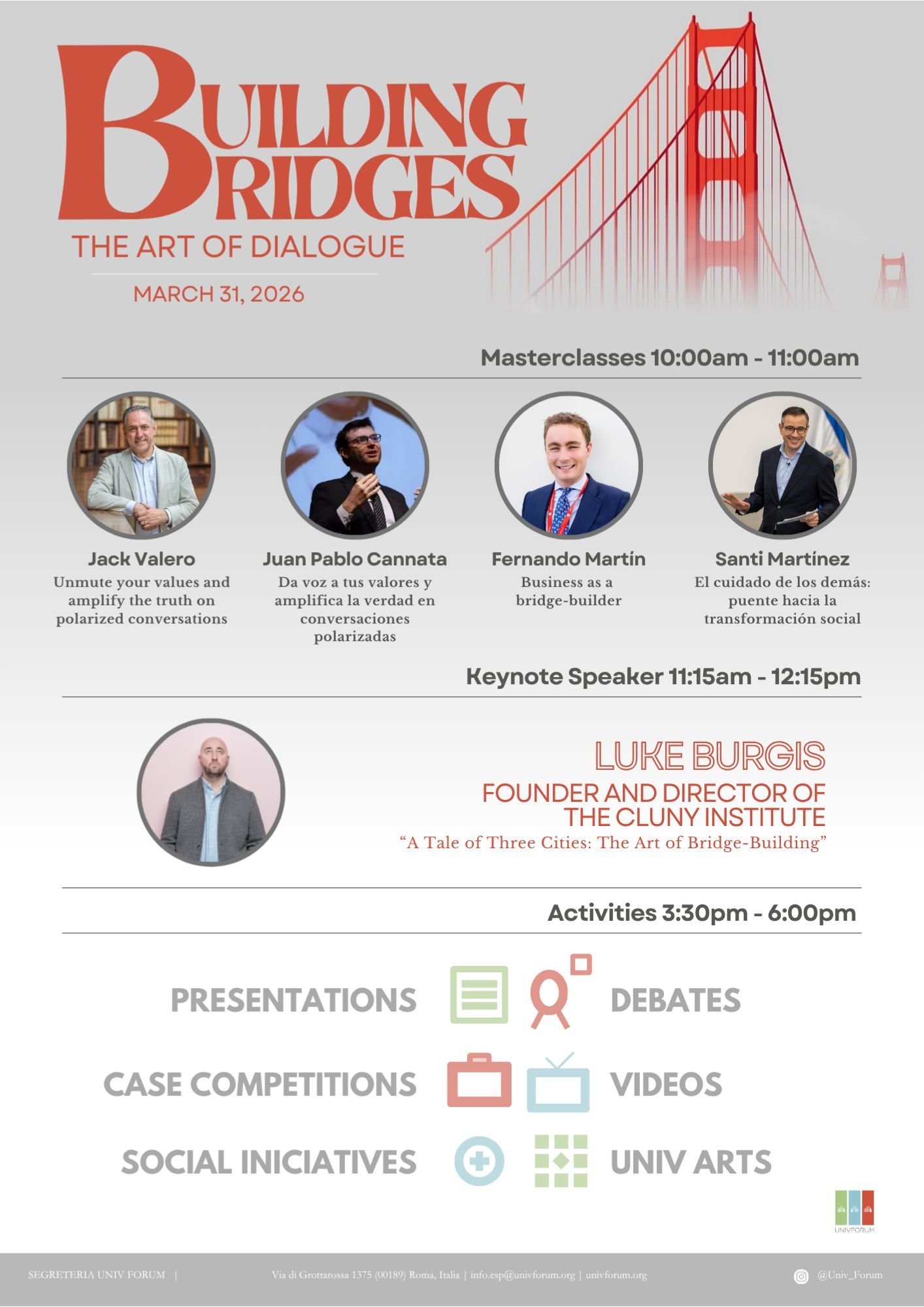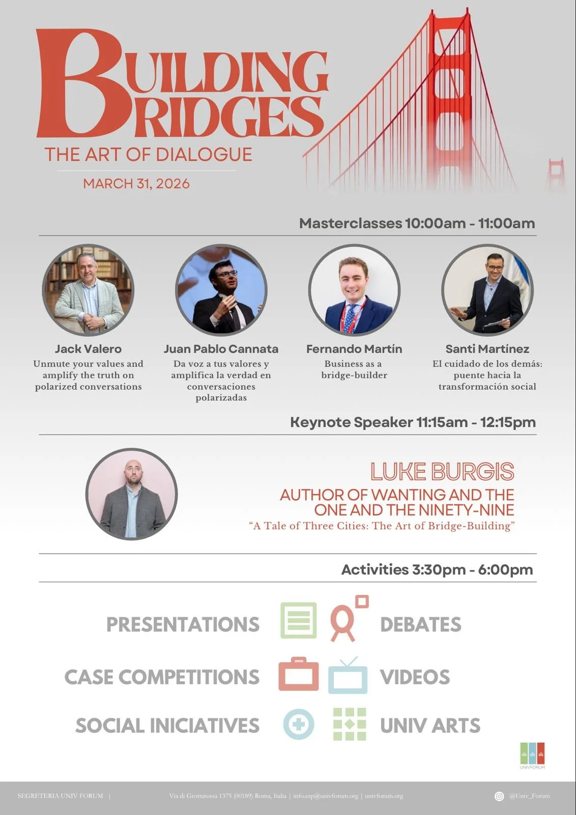 El UnivForum es un encuentro anual de estudiantes universitarios en Roma. Durante un día, estudiantes de más de 25 países participan en debates, concursos, exposiciones y una conferencia magistral que gira en torno a un tema único, compartiendo ideas y proyectos con el objetivo de generar un impacto real en la sociedad.
